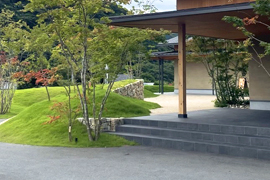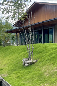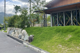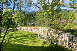 山に囲まれた絶景のロケーションを借景とした芝と石積みの外構です。
