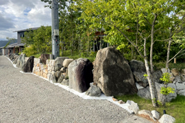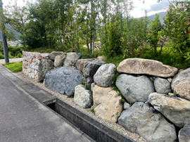 方向の違う石積みが、セミクローズドの外構へ 外構にはクローズド外構とオープン外構があり、その中間にあたるのがセミクローズド外構です。 セミクローズド外構は、セキュリティーでの安全面やプライバシー面も高めつつ、圧迫感のないちょうどよい開放感が得られます。 この2つの石積みがその役目を兼ねています。