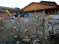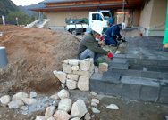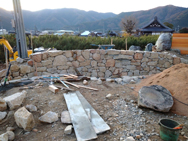 石積みの様子 自然石を直線に積みあげていく為、非常に難しい施工となりましたが、敷地境界との兼ね合いも注意しながら、上部がまっすぐになるよう仕上げました。